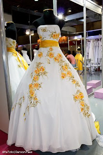 E o post de hj é o último das inspirações dos vestidos de noiva com detalhes coloridos. Depois do vermelho, verde, rosa, azul e preto (amooo), vou postar hj outras cores que são menos usadas então não achei mts vestidos nelas.