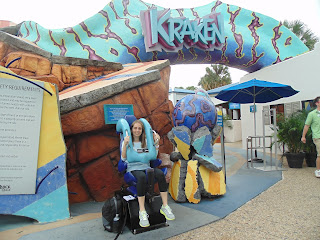 Dentre as montanhas russas encontramos a Kraken, ela é bem alta, bem forte e com um looping no meio, Adorei!